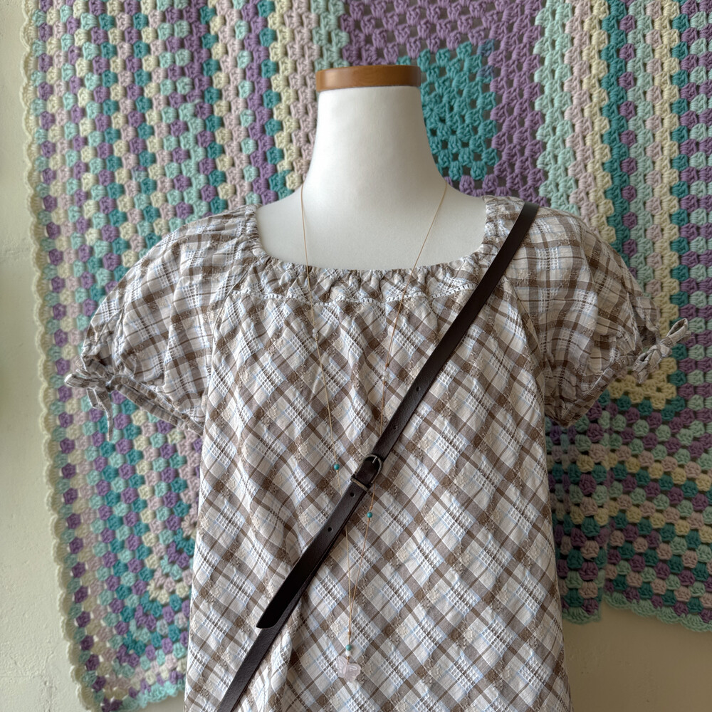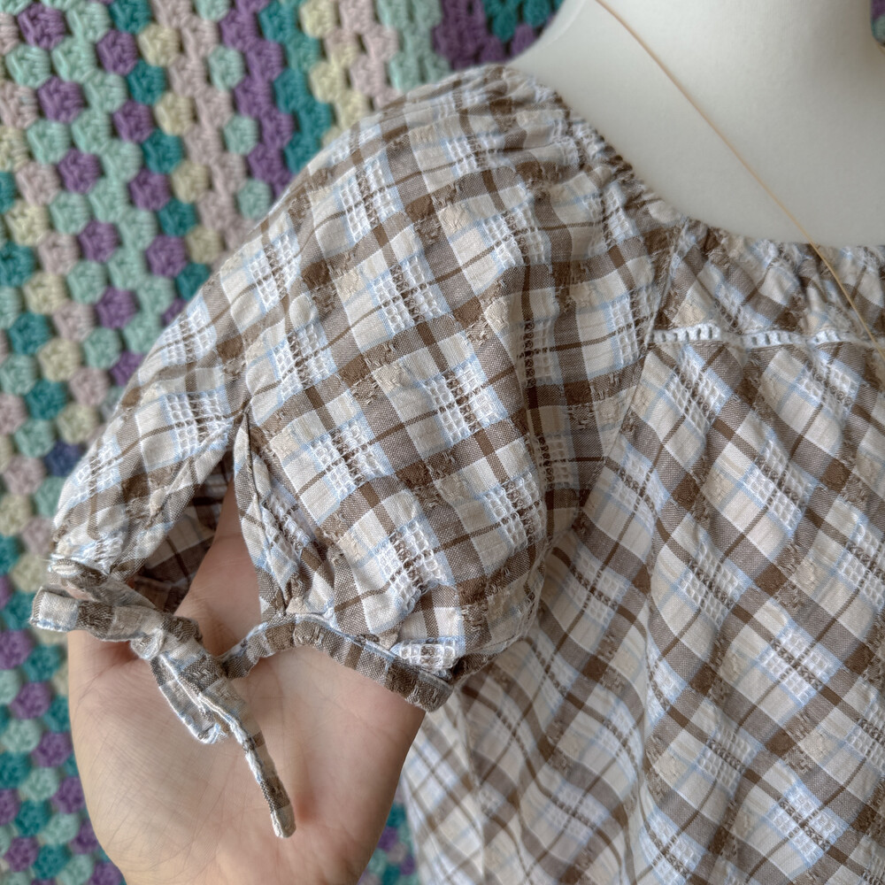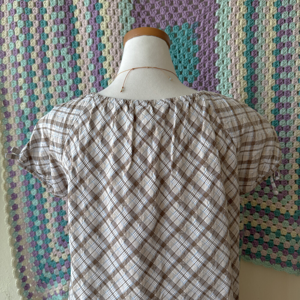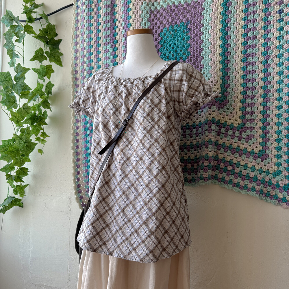 브라운, 블루, 베이지 색감 조합의 체크 블라우스예요