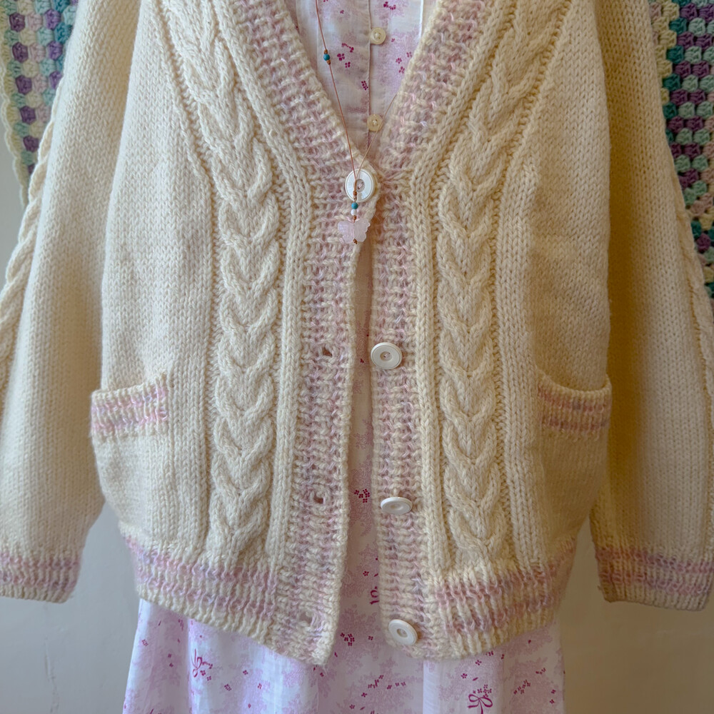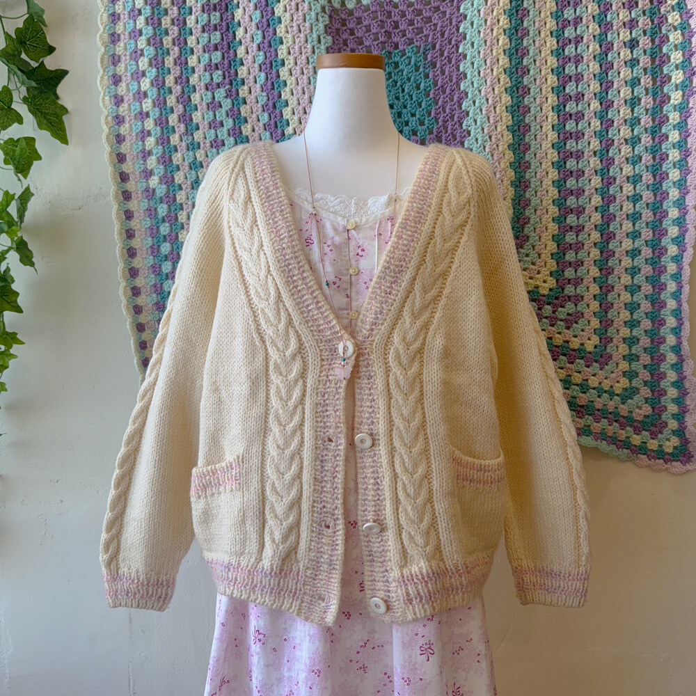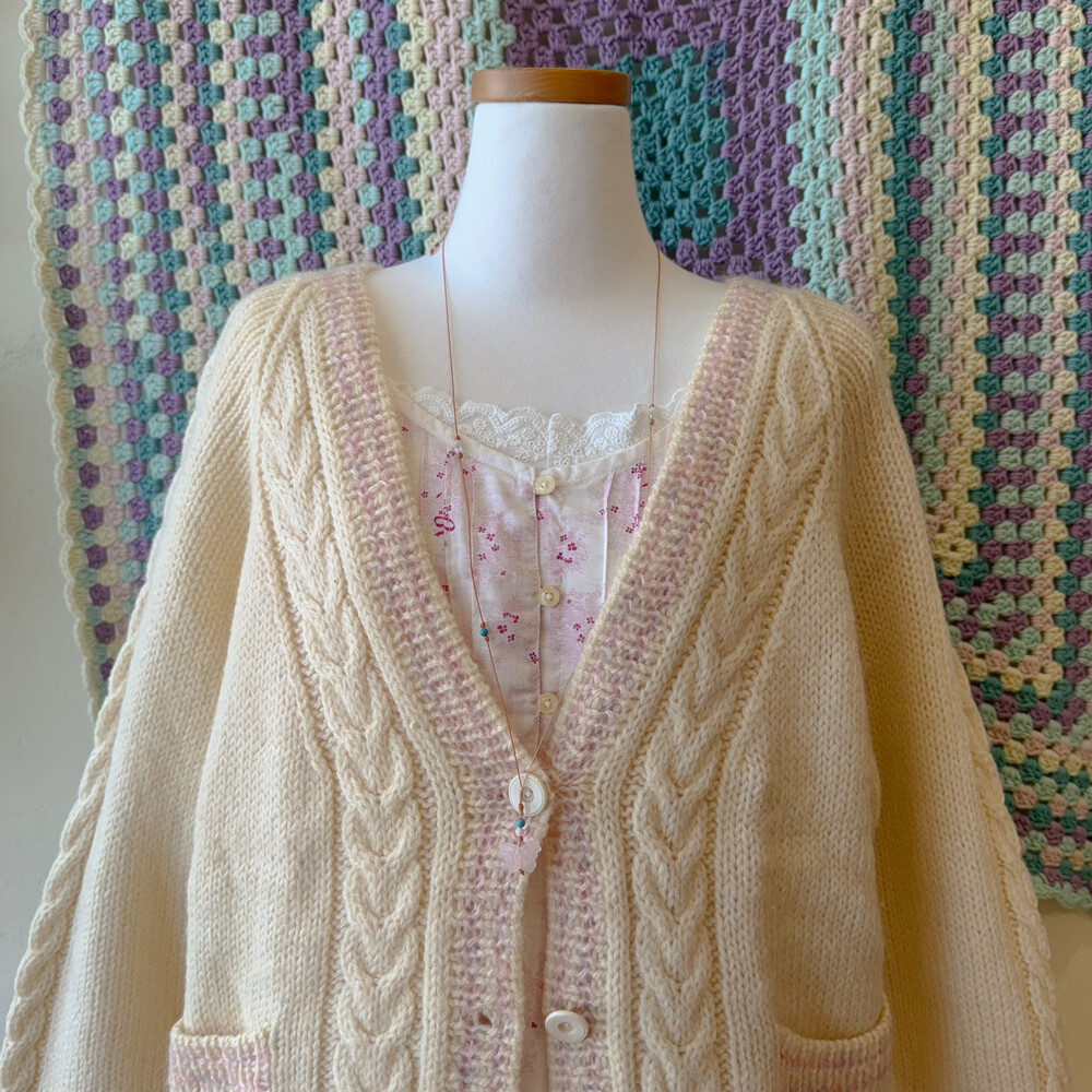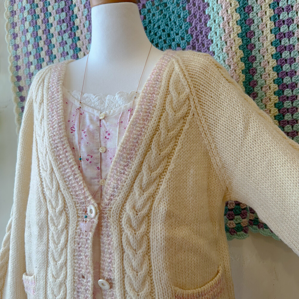 아이보리 색감 베이스의 브이넥 가디건이에요