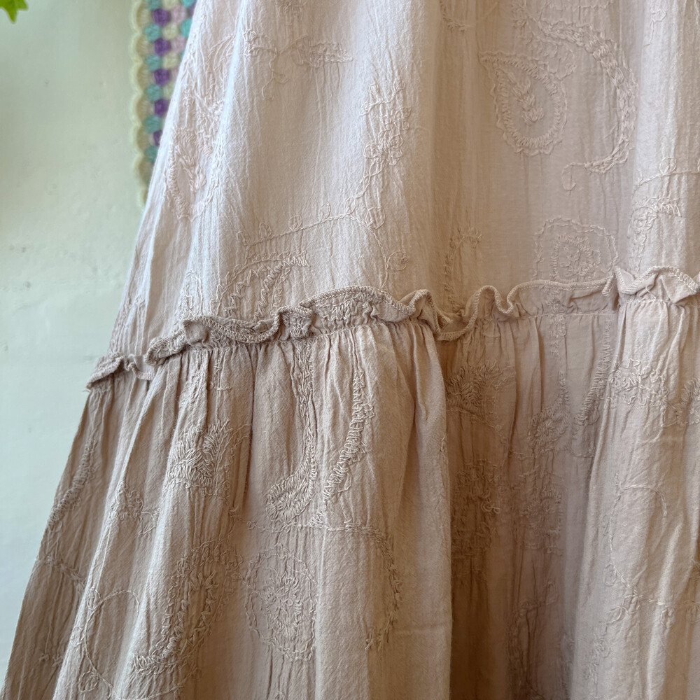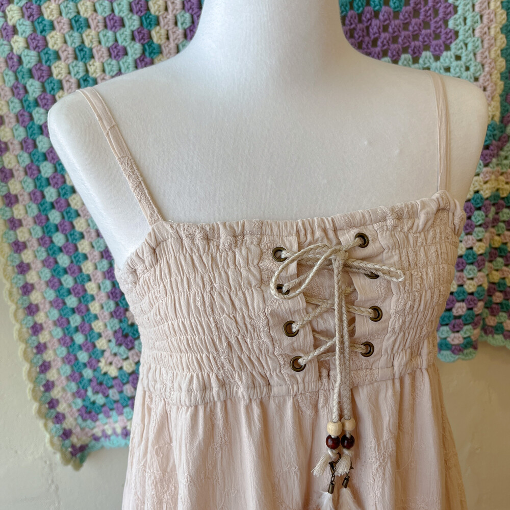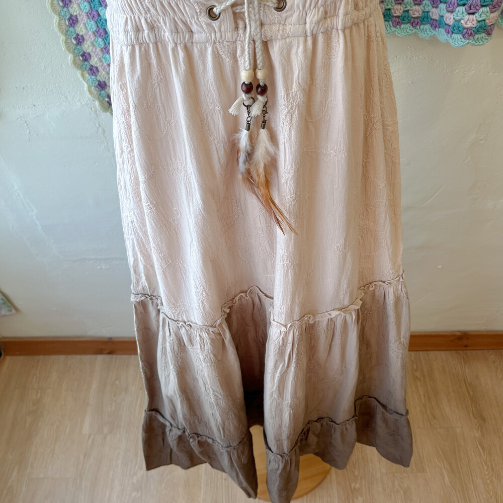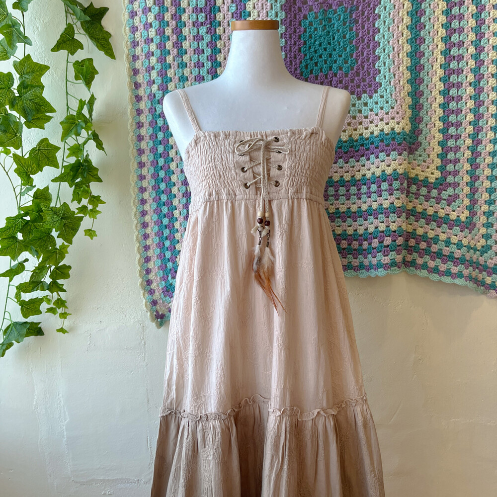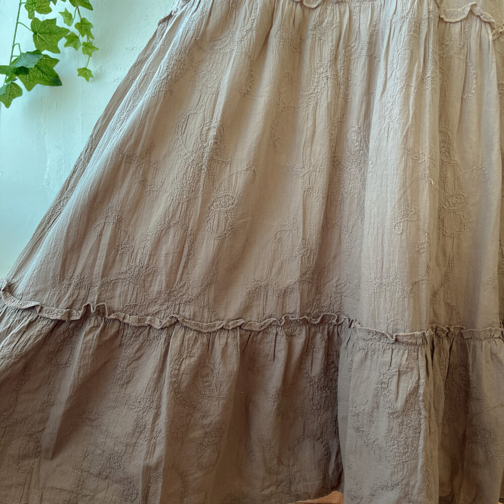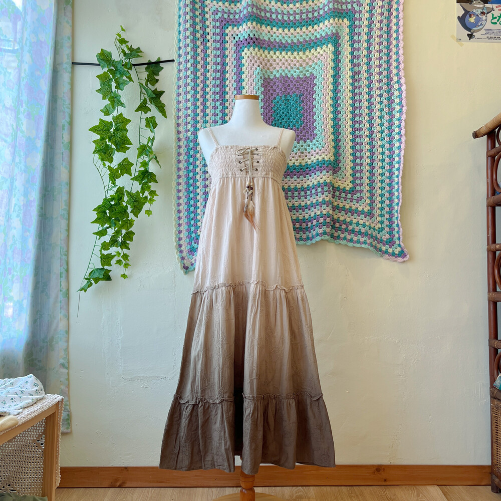 고동색 그라데이션 코튼 아일렛 끈원피스예요