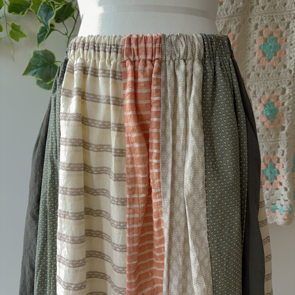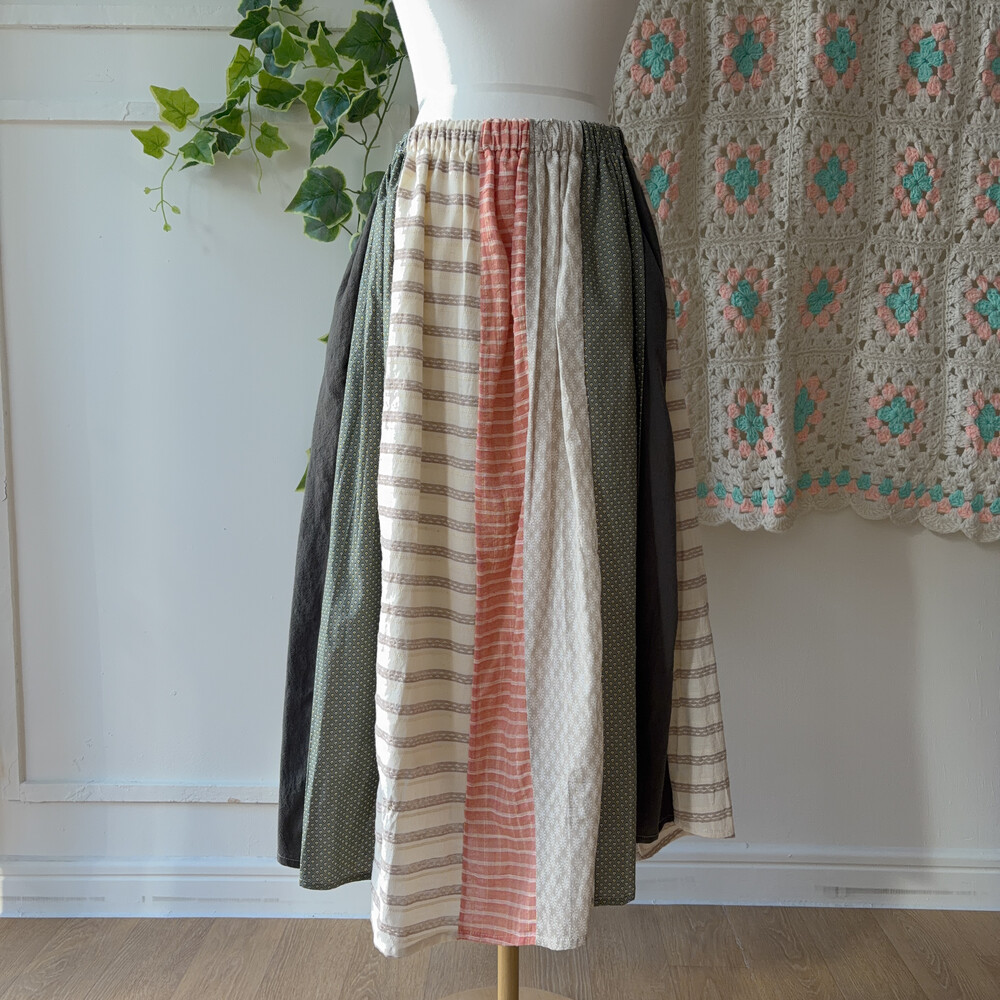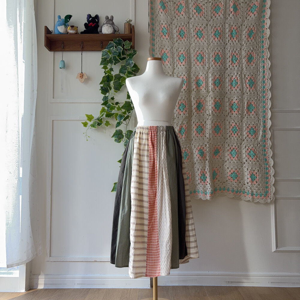베이지, 그린, 살구색감 조합의 세로 패치워크 스커트예요