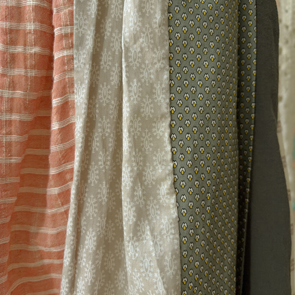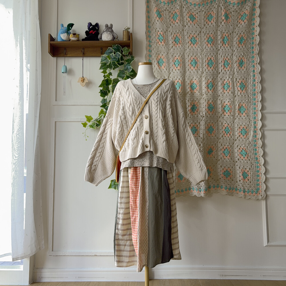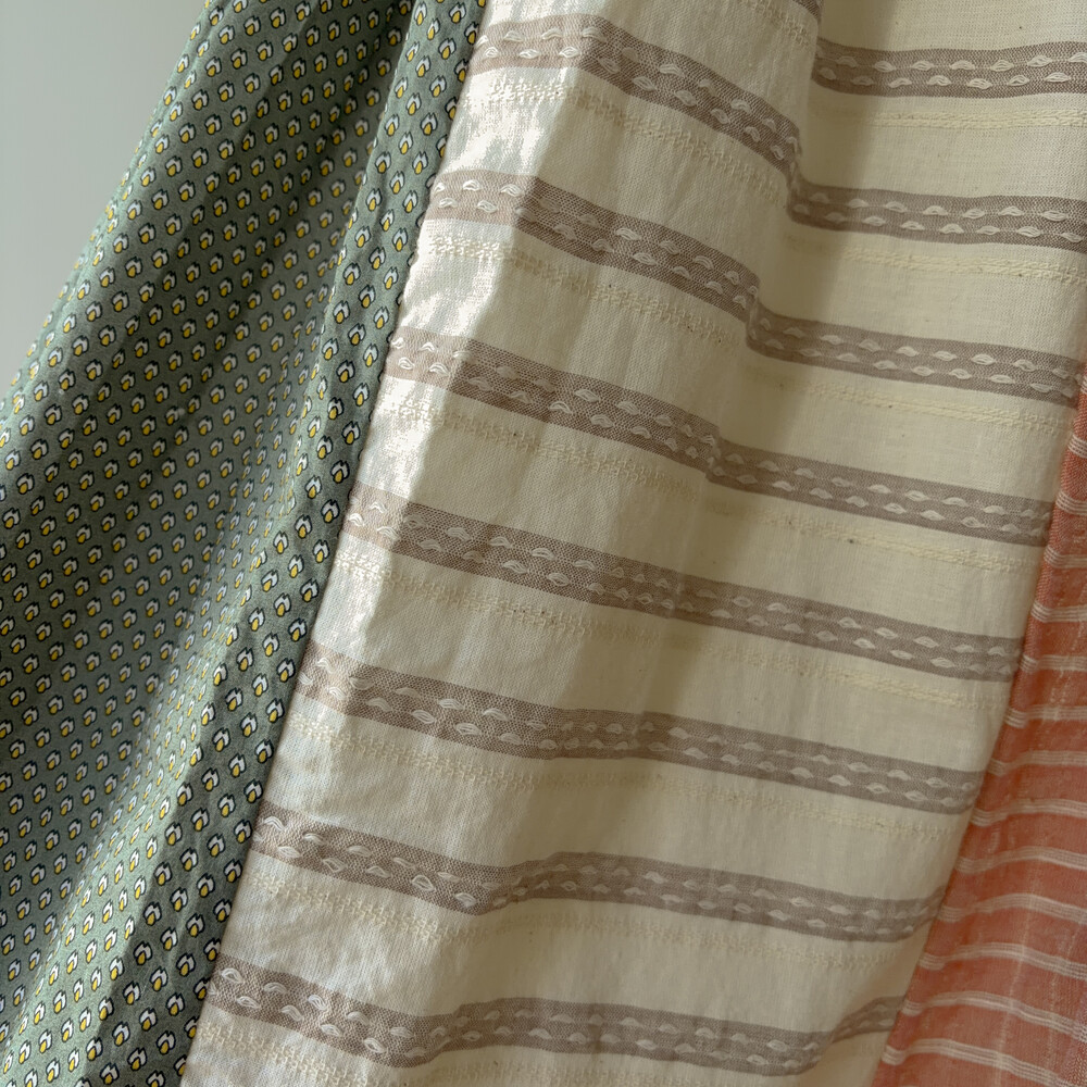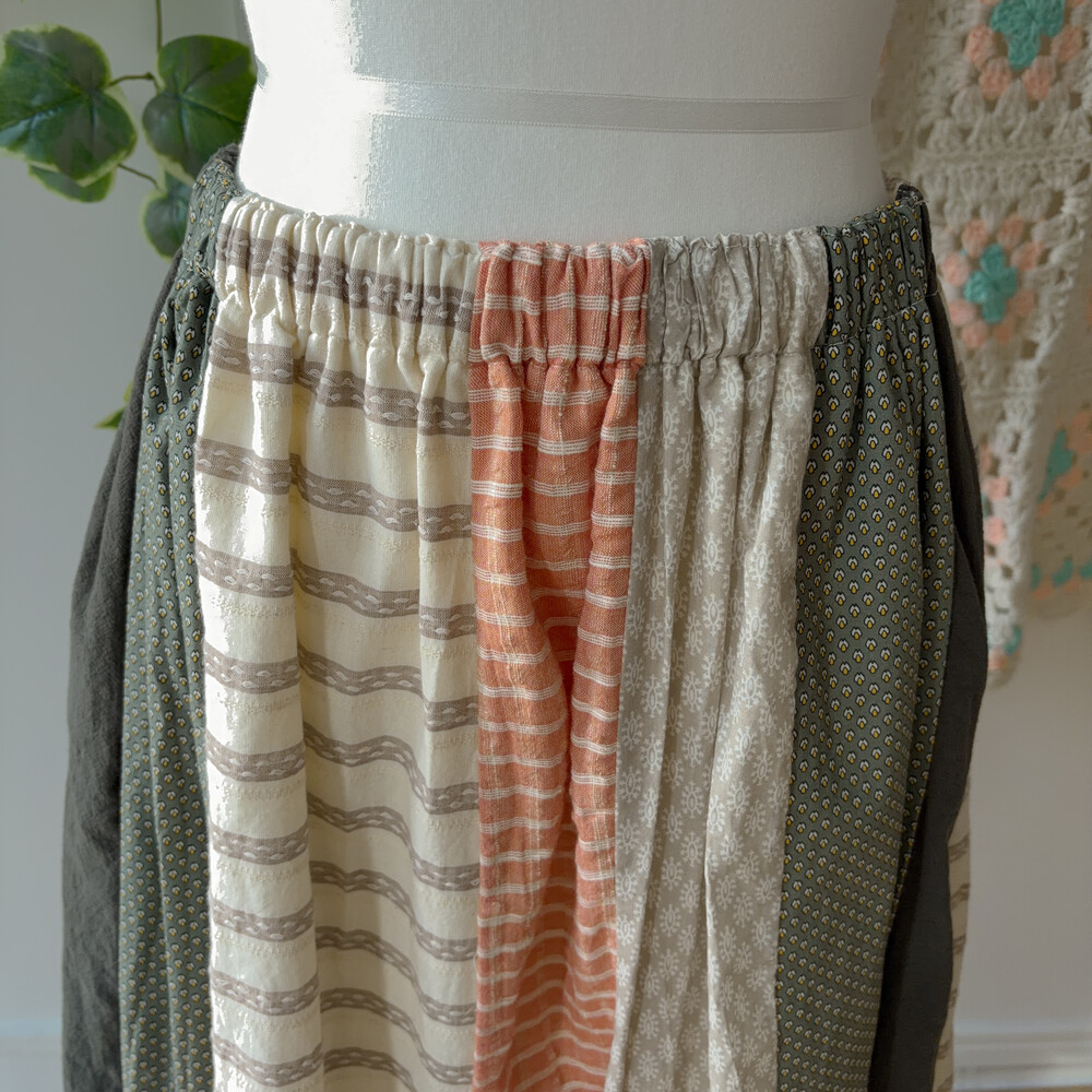 베이지, 그린, 살구색감 조합의 세로 패치워크 스커트예요