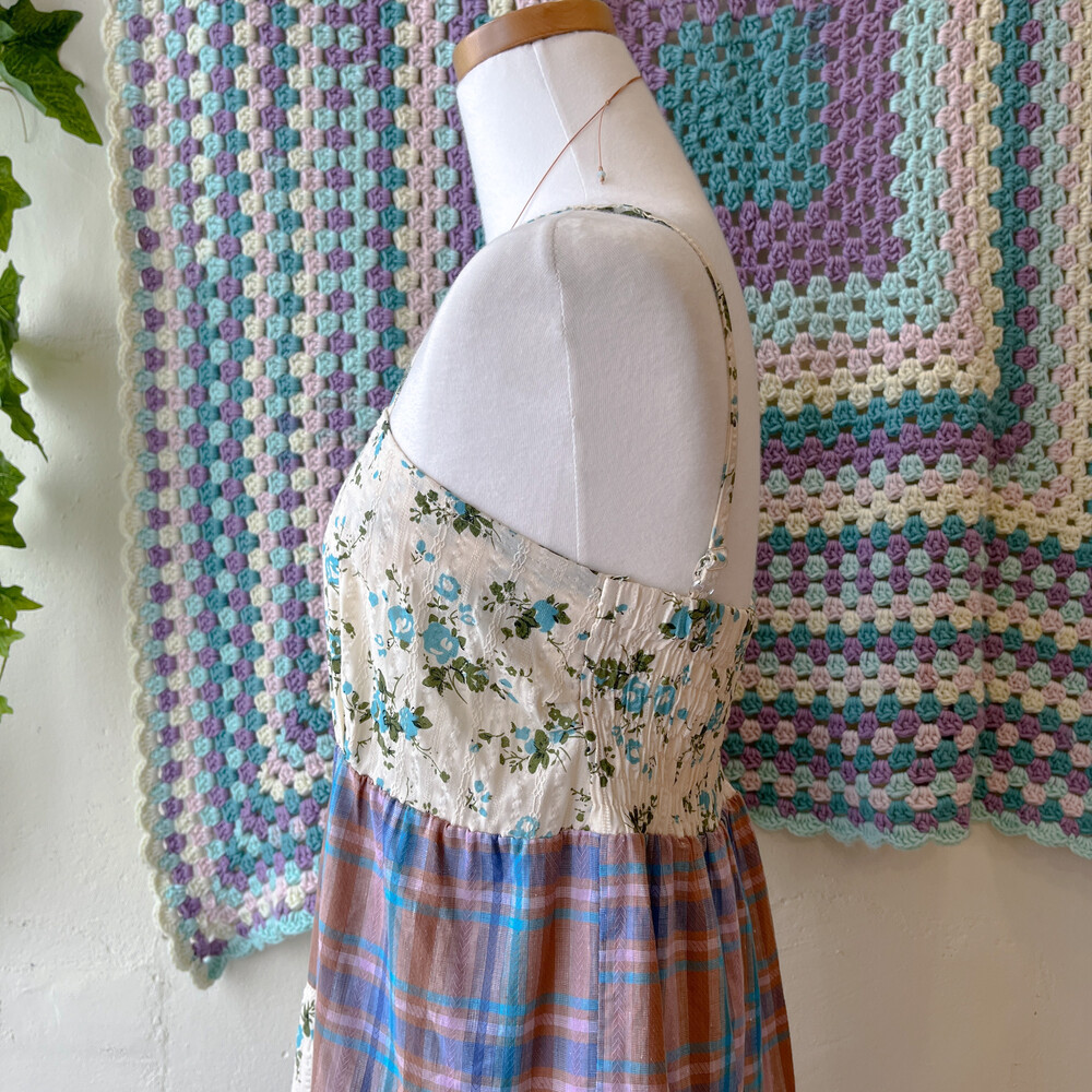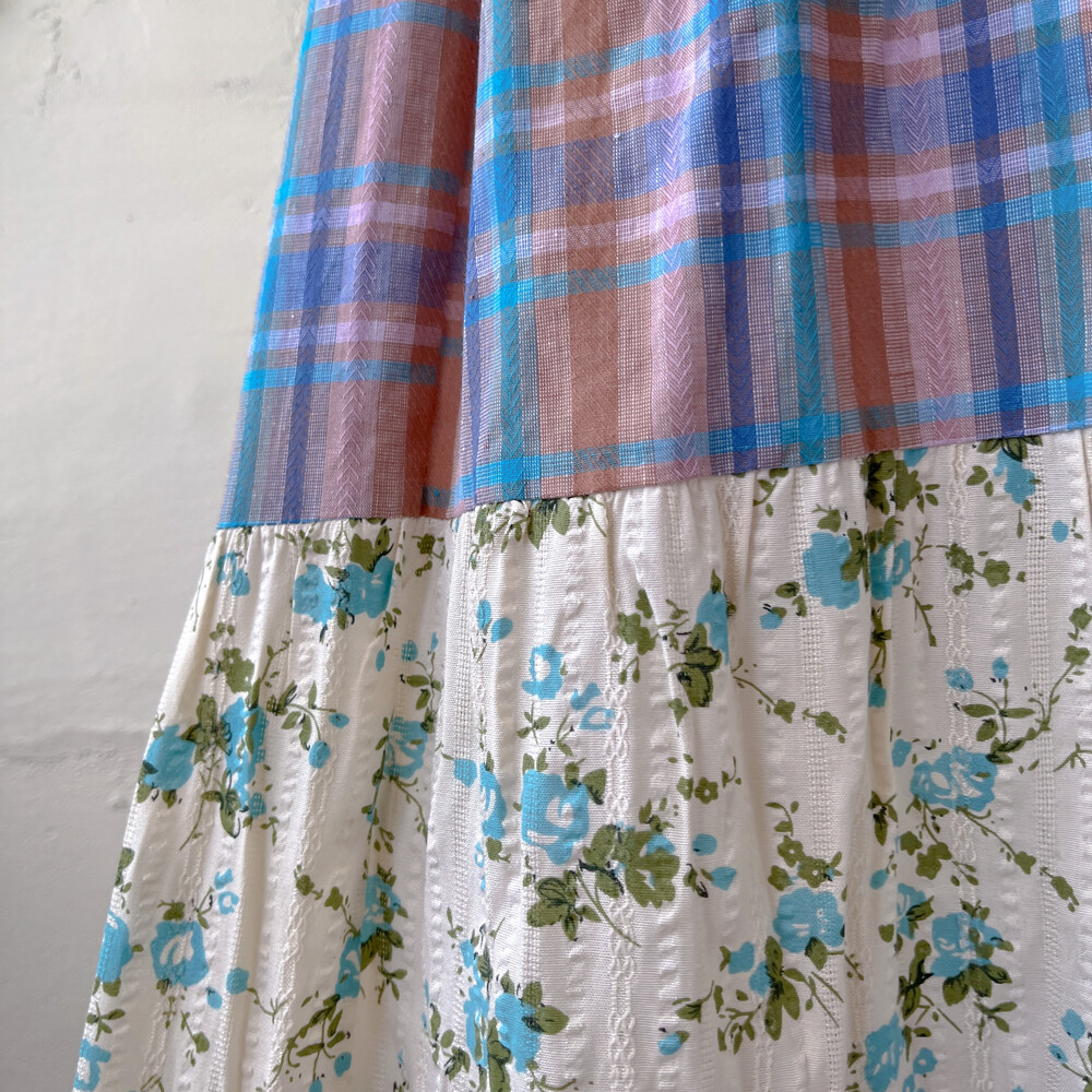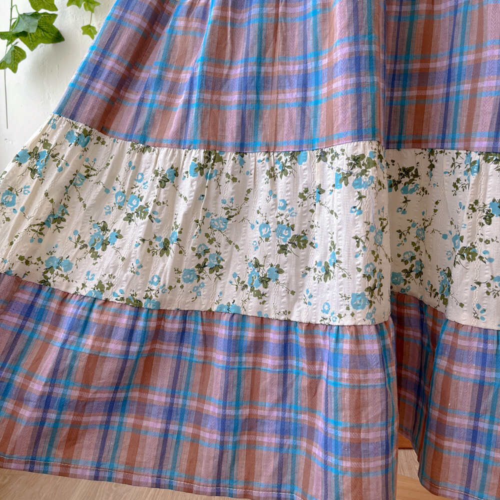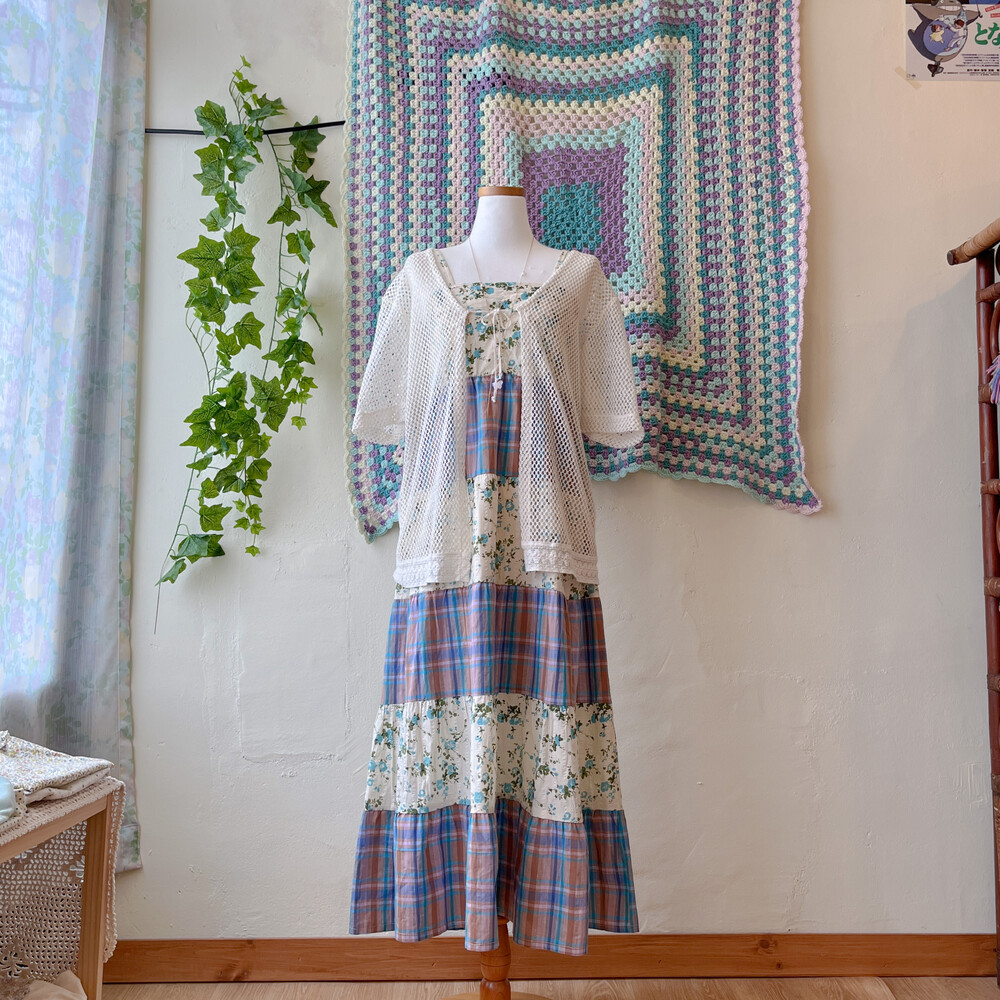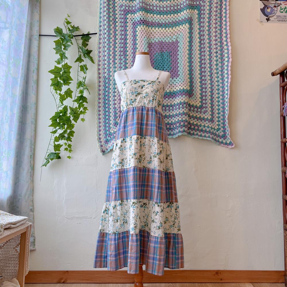 블루 잔꽃 패턴과 체크 패치워크 끈원피스예요