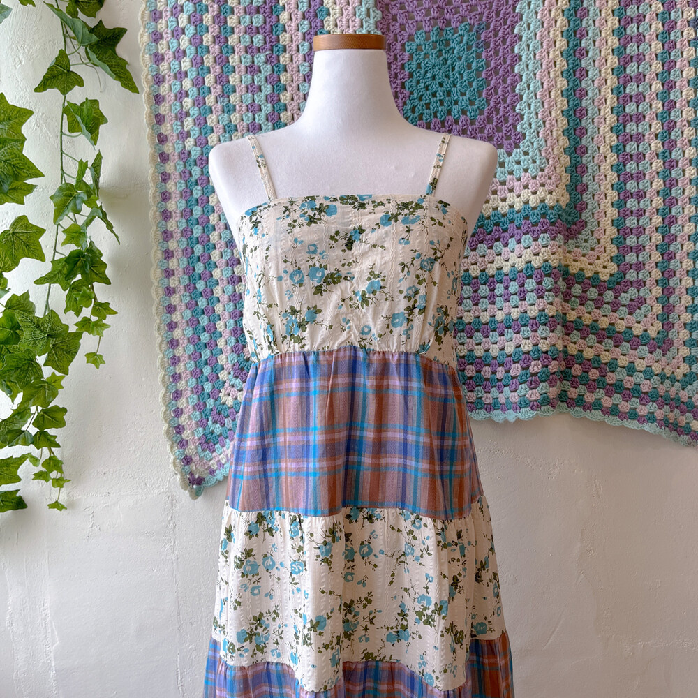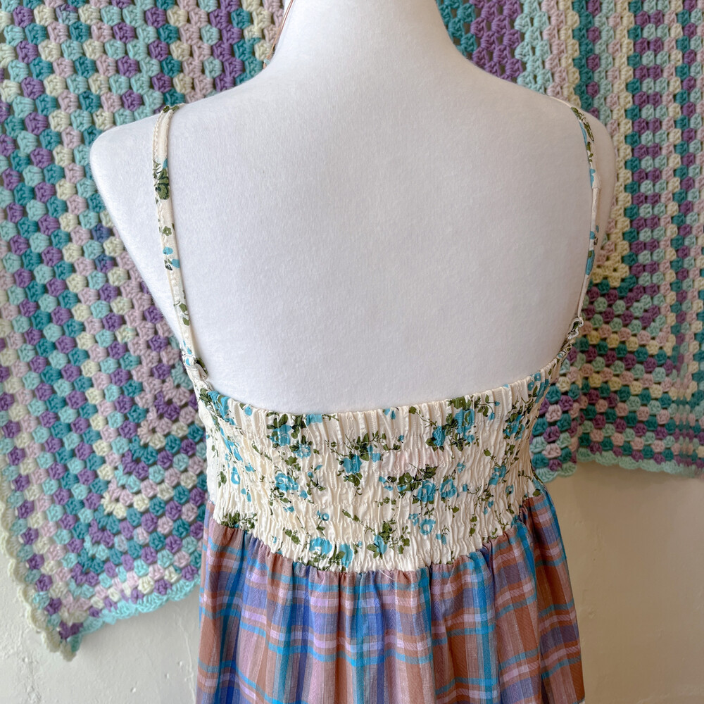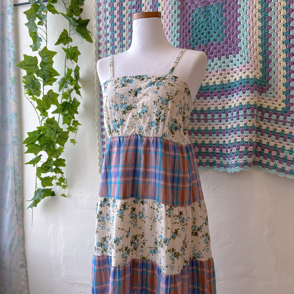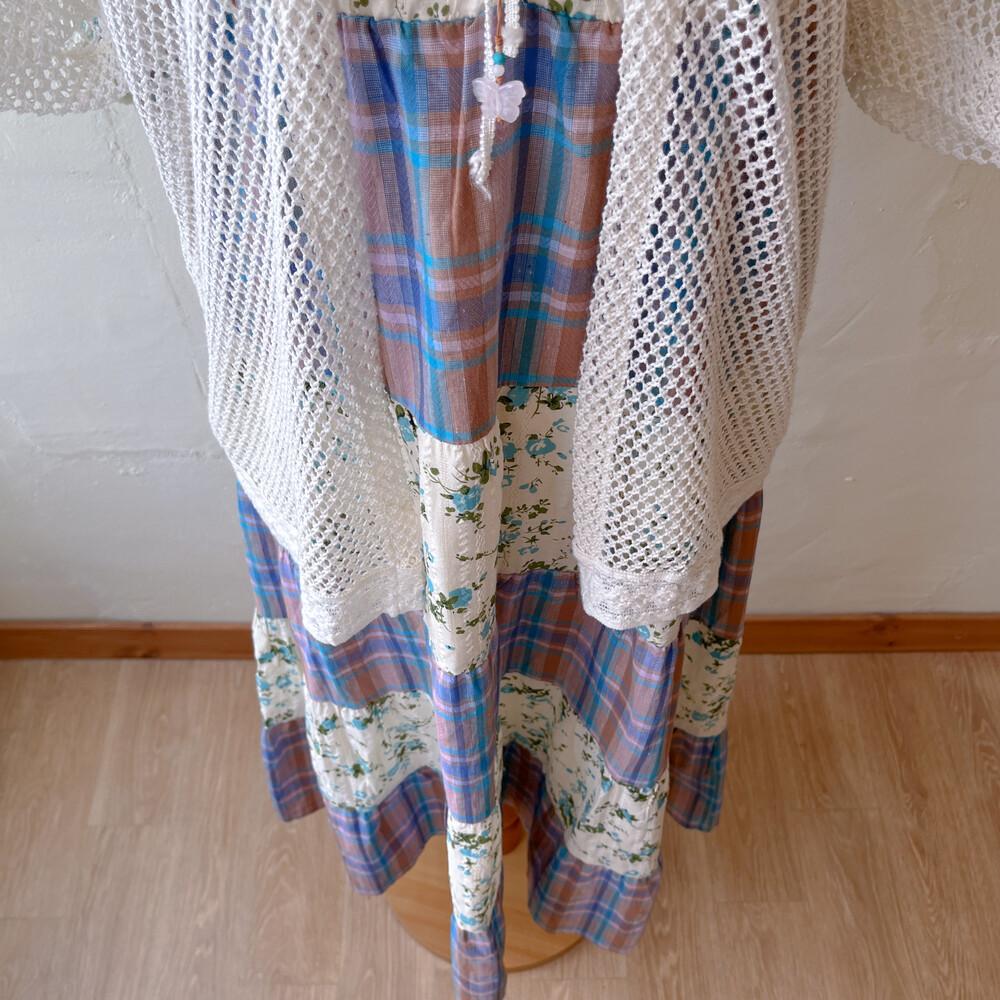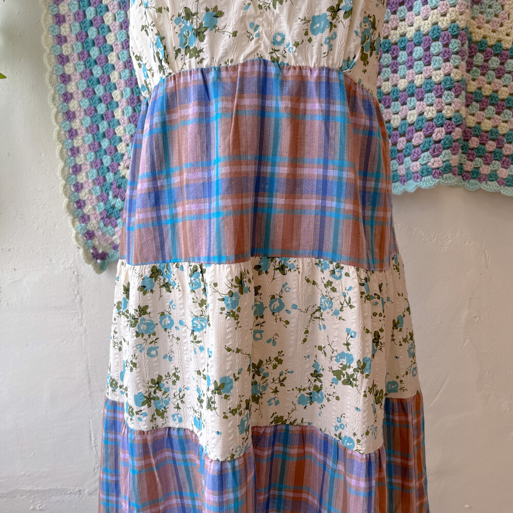 블루 잔꽃 패턴과 체크 패치워크 끈원피스예요