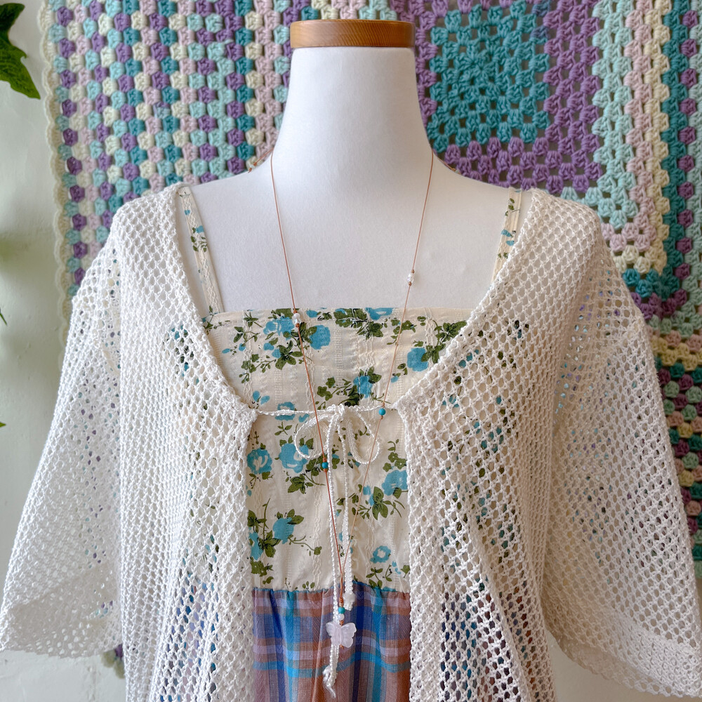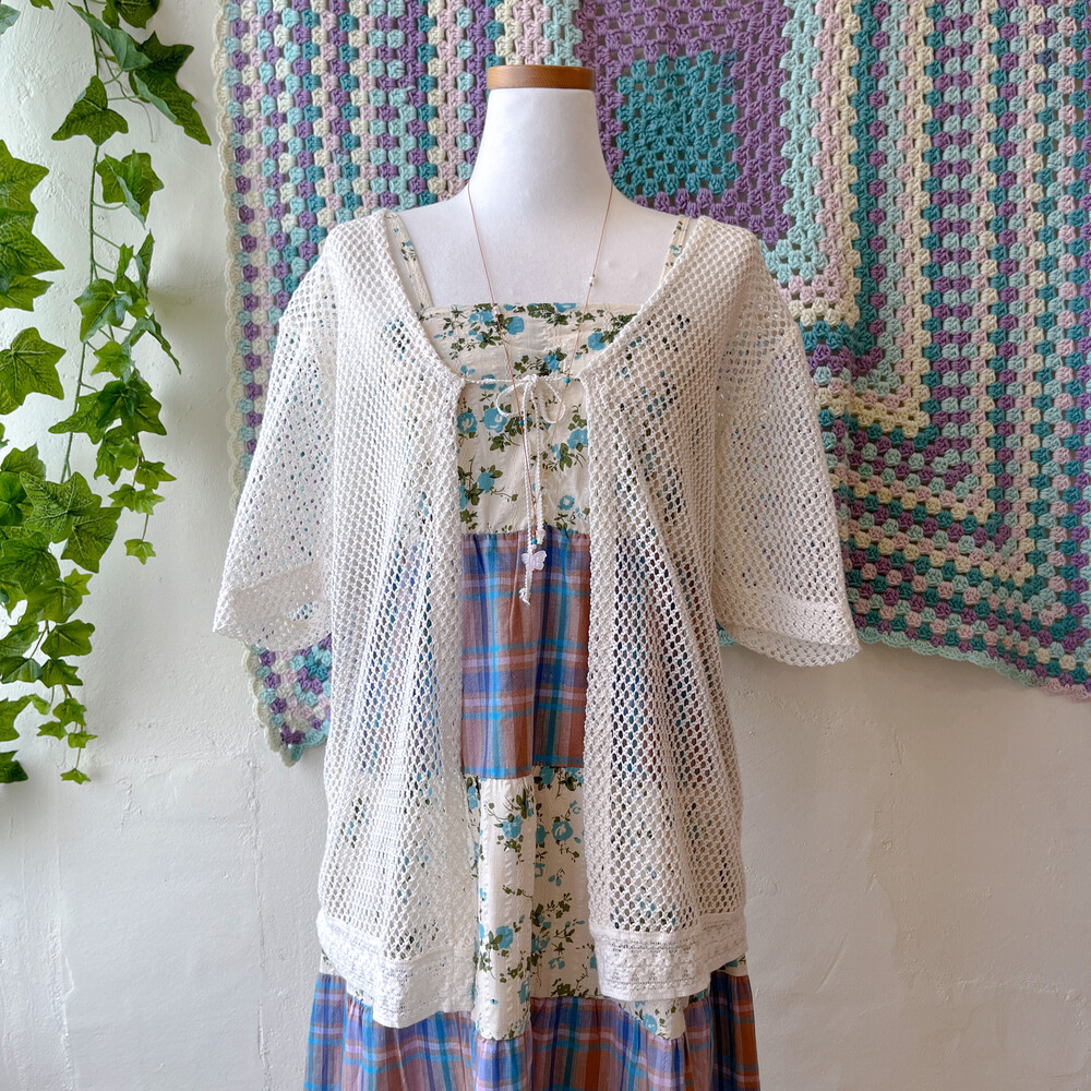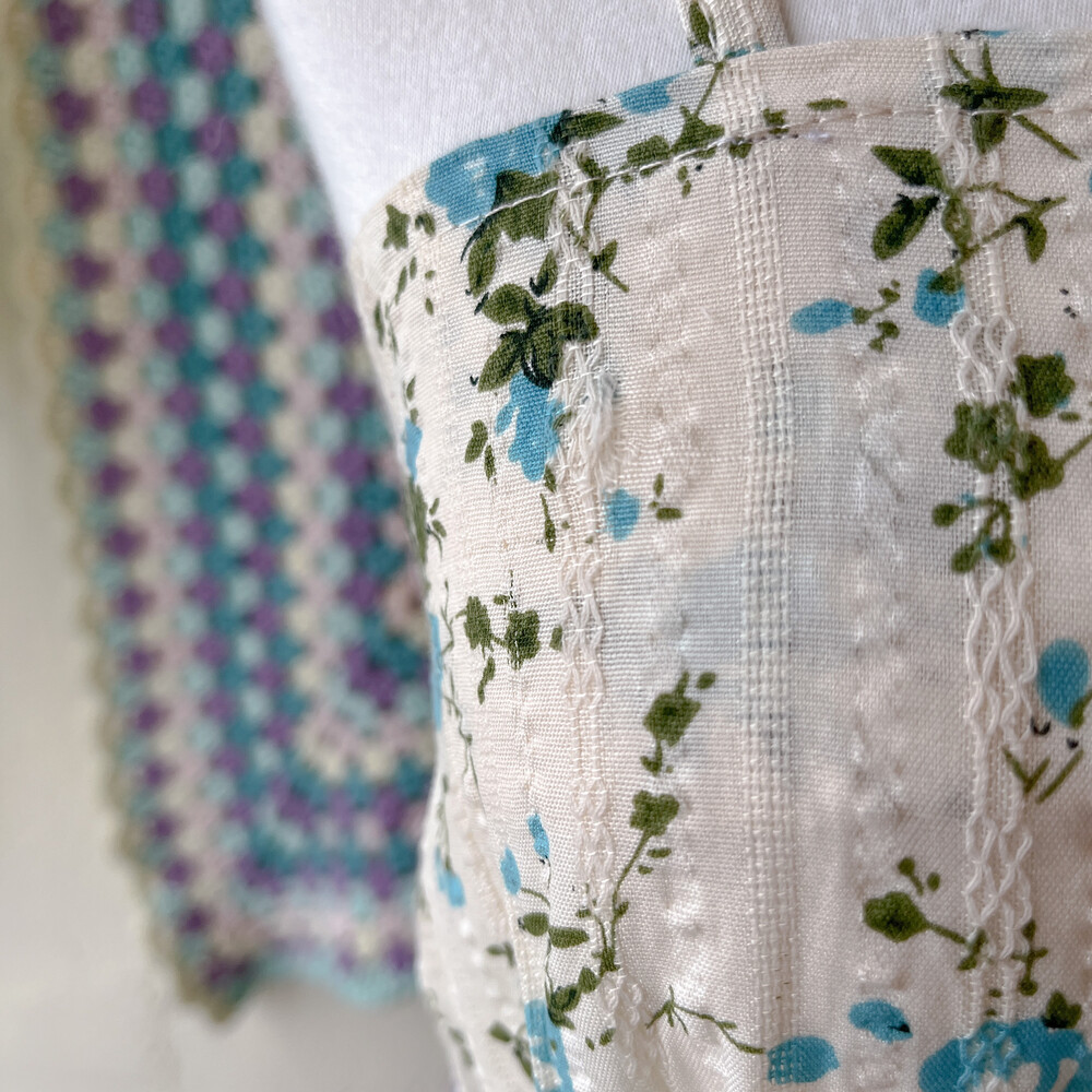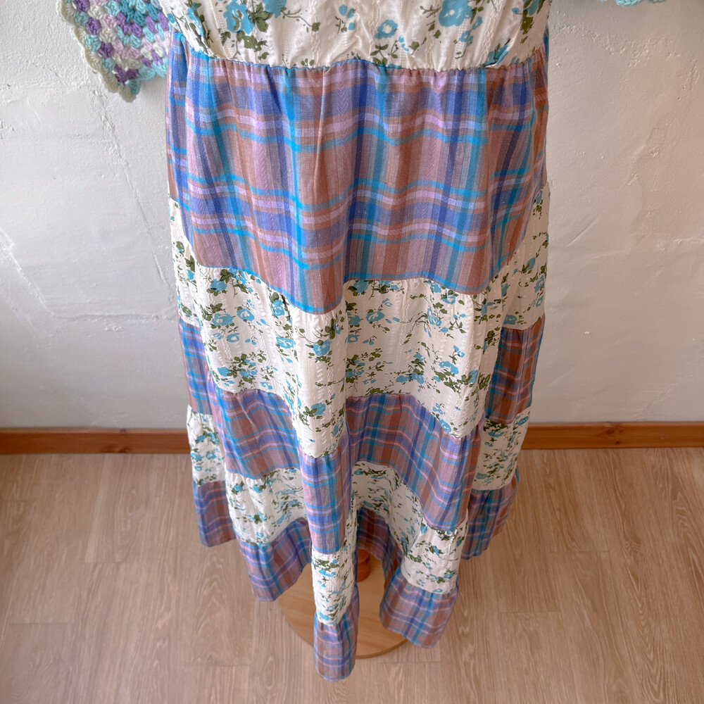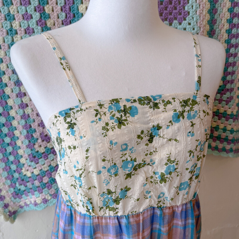 블루 잔꽃 패턴과 체크 패치워크 끈원피스예요