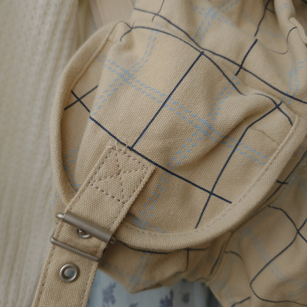 베이지 바탕에 하늘색 체크 패턴이 들어가 있는